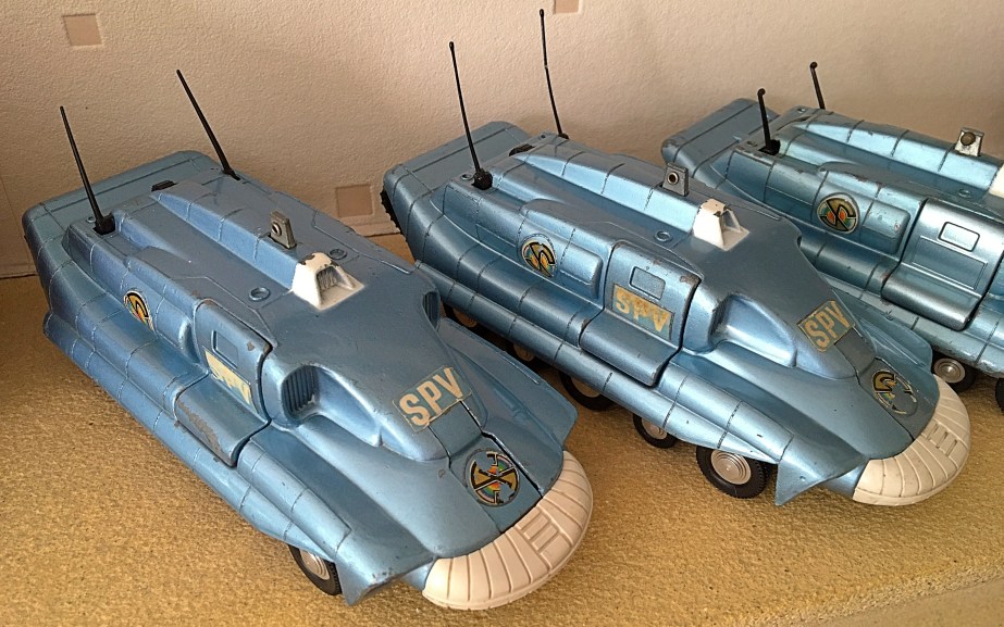 Some of the most popular vehicles were the Shado mobiles, tank like tracked vehicles that were the first line of defence when the critters landed on Earth. Dinky’s first version was strangely issued in olive green which made it look more like a tank but sadly was somewhat inaccurate as the vehicles should have been painted a light grey-blue.