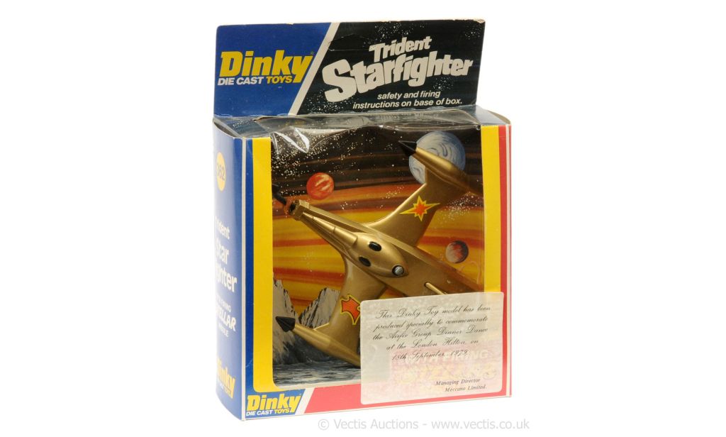 VECTIS AUCTIONS Thursday 21st January:Dinky 362 Trident Starfighter RARE VARIATION – finished in gold, black missiles – condition appears to be generally Near Mint in a Good Plus to Excellent window box with “This Dinky Toy model has been produced specially to commemorate the Airfix Group Dinner Dance at the London Hilton on the 18th September 1979.