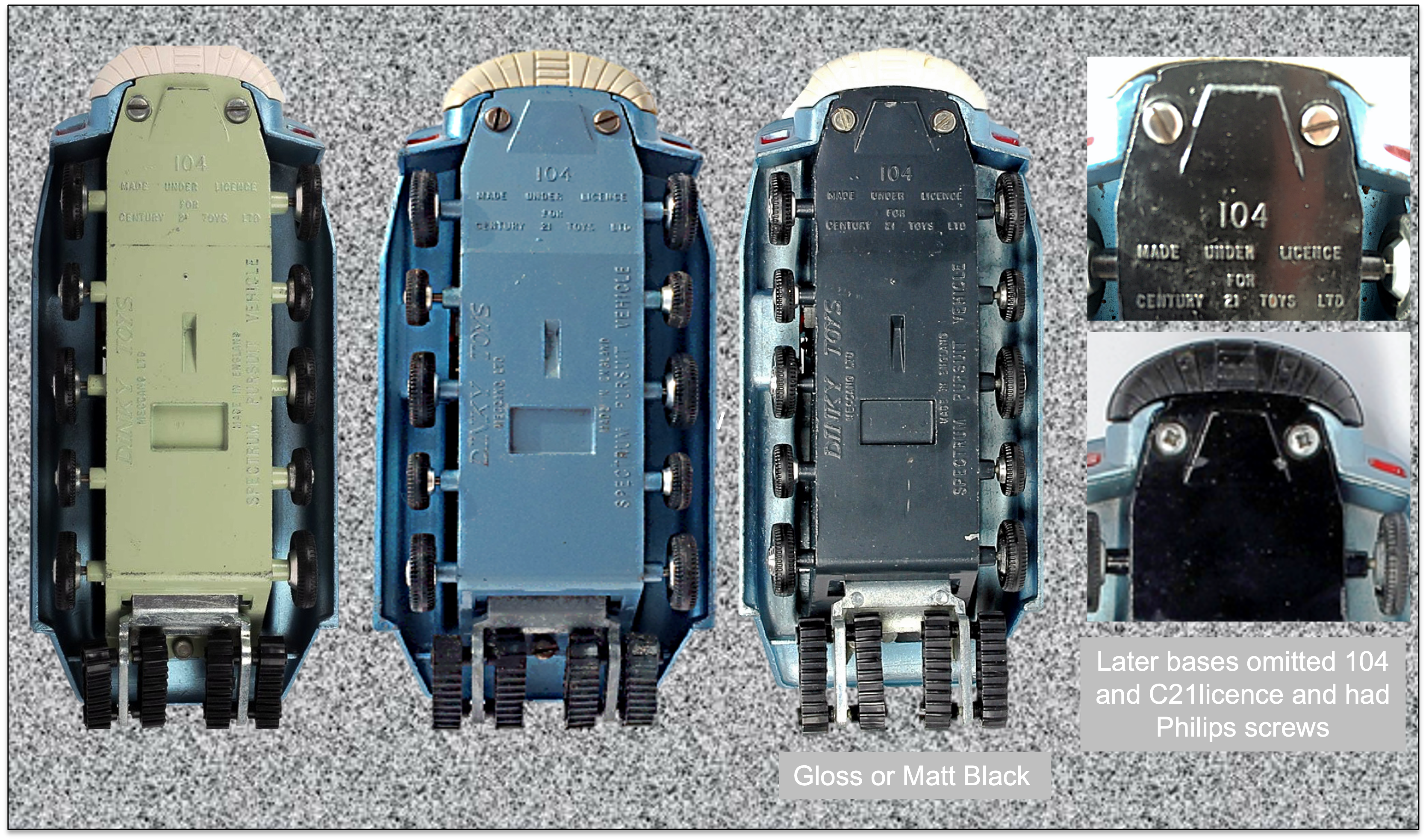 The base of the SPV was initially blue but later versions had either matt or gloss black bases. A rarer colour was light green. This was similar in colour the 353 SHADO Mobile. The later versions dropped the C21 licence text and the number and these could be on blue or black bases.