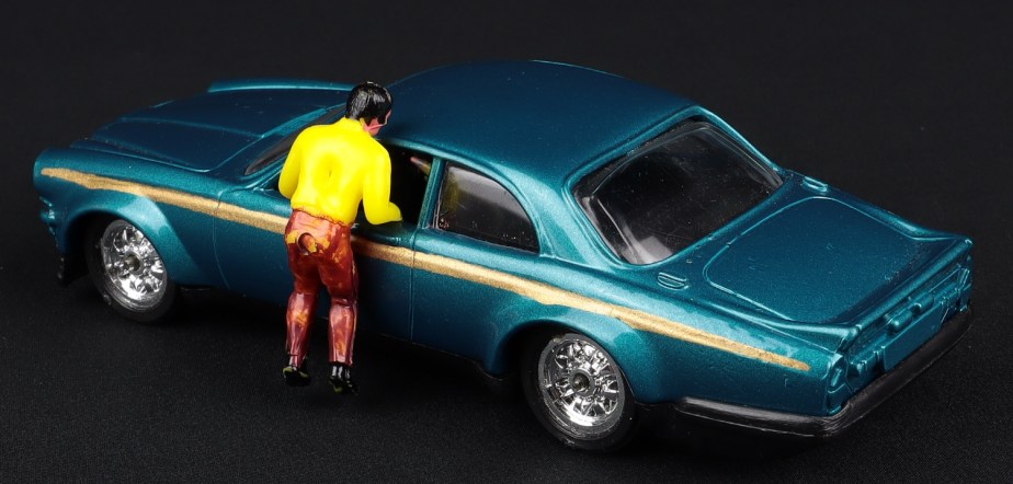 The model was planned to come with a ‘criminal’ who would be flung off the car as it moved away. There is no evidence of any mechanical or spring loaded mechanism to do this and it’s possible the action relied on the figure having uneven legs.