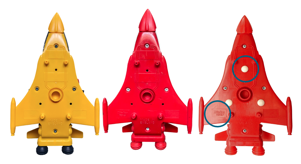 When the Cosmic Cruiser was reissued as the Zygon Marauder, painted red and white as part of the Dinky Toys range, the name Dinky Toys was added to the base and the labels were changed to reflect the ‘Zygon’ connection.